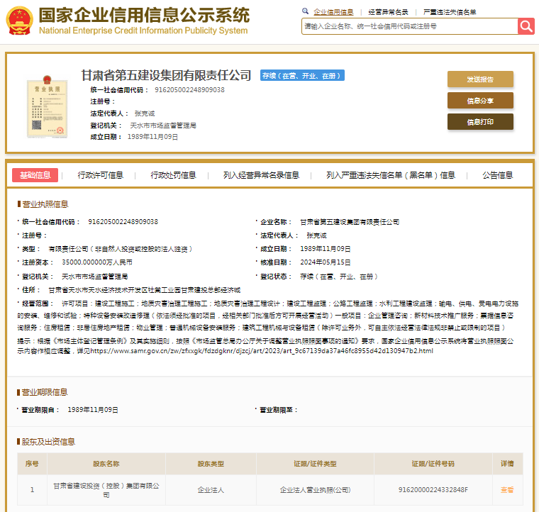 国家企业信用信息公示系统显示,甘肃省第五建设集团有限责任公司成立于1989年,注册资本35000万元人民币,法定代表人为张克诚,由甘肃省建设投资(控股)集团有限公司全资持股。