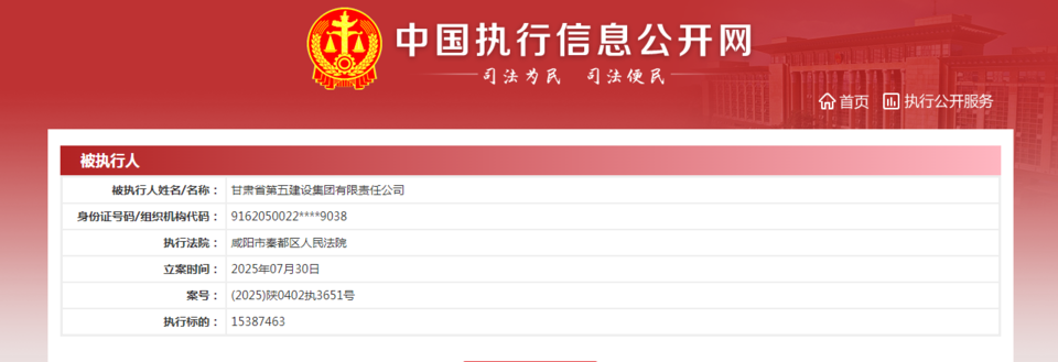齐鲁晚报·齐鲁壹点记者于中国执行信息公开网了解到,在7月30日宇轩配资,甘肃建投旗下的甘肃省第五建设集团有限责任公司(下称“甘肃建投五建公司”)新增一条被执行信息,其被咸阳市秦都区人民法院执行标的15387463元,案号(2025)陕0402执3651号。