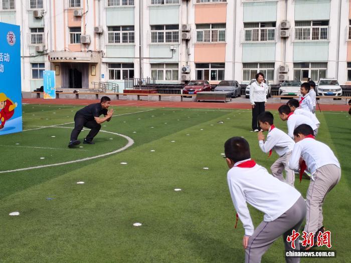 9月22日,“中华体育精神大讲堂”校园宣讲活动、“冠军体育课”运动员进校园活动在北京市朝阳区呼家楼中心小学举行。图为短道速滑世界冠军李佳军(左)向同学们示范动作。中新社记者 国璇 摄