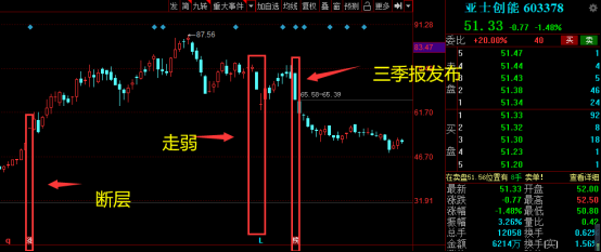 逻辑改变的例子就是亚士创能。这个在中报的时候的逻辑是竣工周期,以及行业集中度的提升。因此市场给予的期望也比较大,但是就在三季报发布的前夕,亚士创能走势就直接开始走弱,等三季报正式发布的时候,果然,三季报完全不及预期,市场集中度上升和竣工链的逻辑就被证伪了。在这种情况下,它当前的市值是没有办法支撑它的增速的,因此当天就跌停,随后就开始了一波下跌的走势。