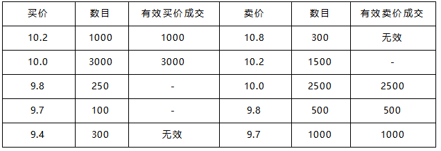 假设基准成交价是10元,大于等于10元的买单有4000手,小于等于10元的卖单有4000手,因此10元的价位会成交4000手,,有1500手无法成交;